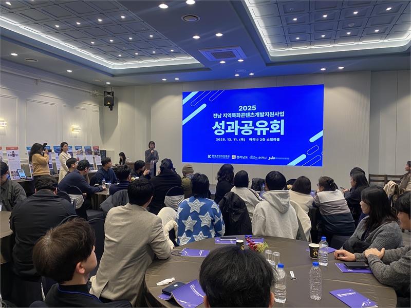 [한국다중뉴스 = 양희성 PD](재)전남정보문화산업진흥원(원장 이인용)은 12월 11일(목) 순천에서 개최한 [2025 전남 지역특화콘텐츠개발지원사업 성과공유회]를 성황리에 개최했다고 밝혔다. 이번 성과공유회는 2025년 한 해 동안 지원사업을 통해 개발된 지역 콘텐츠의 성과를 공유하고, 2026년 사업 추진 방향을