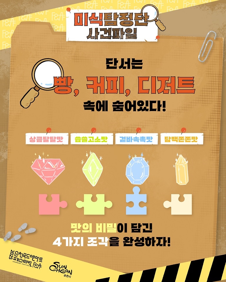 순천시(시장 노관규)는 오는 10월 31일부터 11월 2일까지 3일간, ‘푸드앤아트페스티벌’의 일환으로 방탈출형 미식투어 프로그램 「미식탐정단, 맛의 보석을 찾아라!」를 운영한다고 밝혔다.