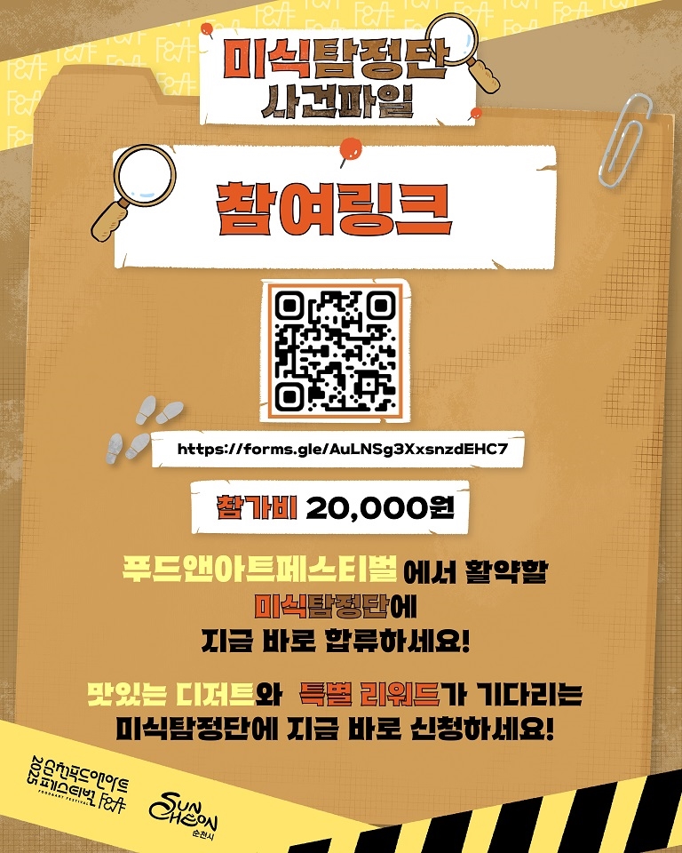 프로그램의 참가비는 1인당 20,000원이며, 선착순으로 300명까지 모집 중이다. 참가자에게는 ▲2만원 상당의 디저트 쿠폰 4종 ▲푸드앤아트페스티벌 쿠폰 등이 포함된 수사키트가 제공된다. 특히 사전신청자에게는 임무완수 후 특별한 기념품까지 증정된다. 사전신청은 10월 29일까지 온라인 링크( forms.gle/AuLNSg3XxsnzdEHC7)를 통해 가능하다.