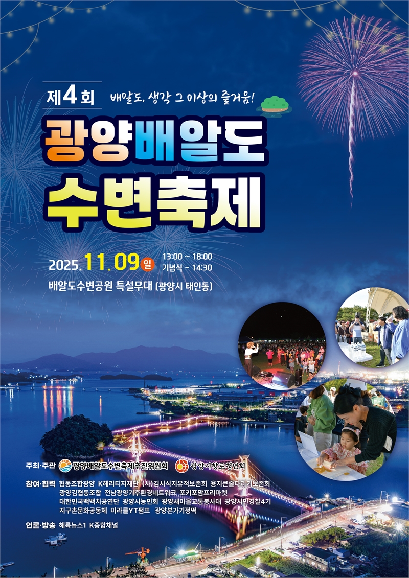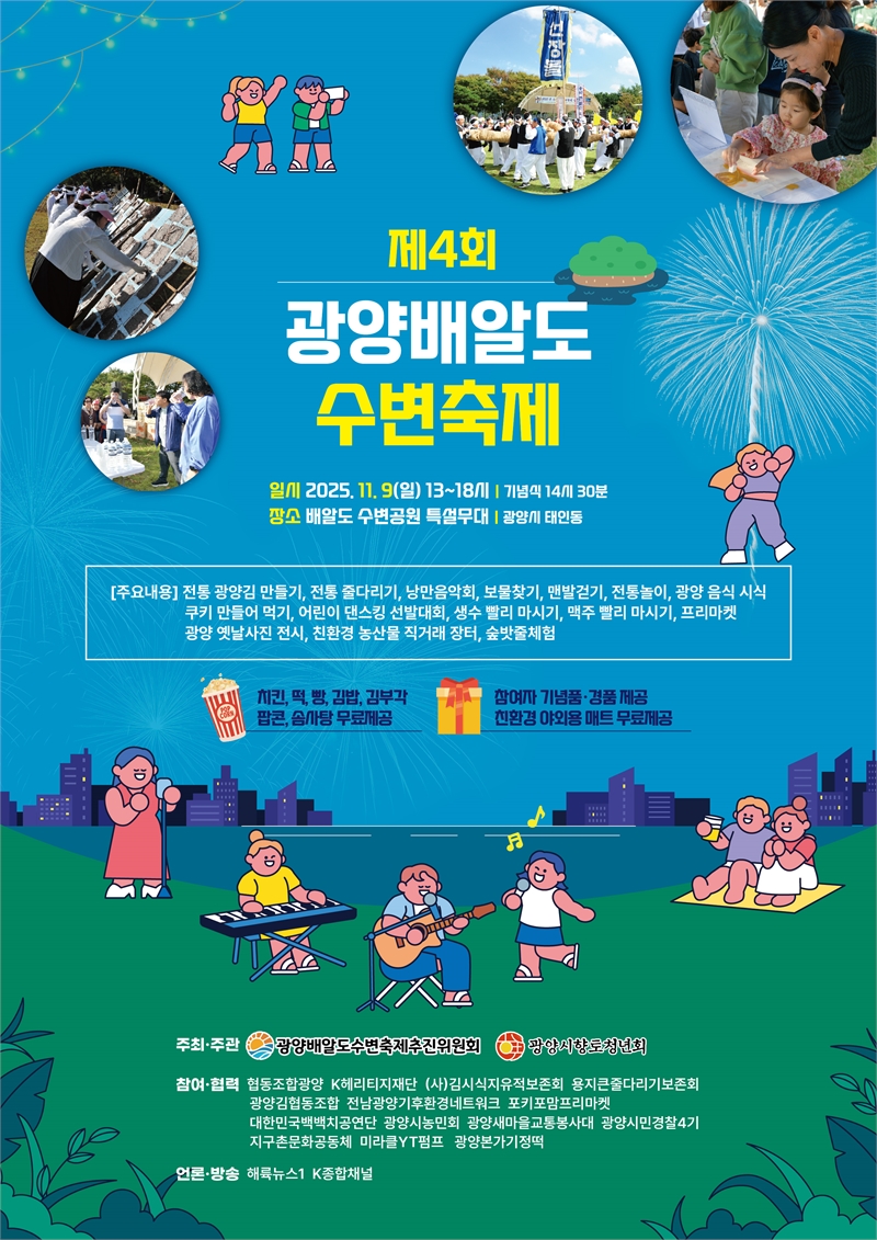 김대성 광양배알도수변축제 추진위원장은 “배알도수변공원·섬정원은 광양시민들의 대표 휴식 공간이자 관광 명소로 자리잡았다”며 “섬진강권 자연환경과 역사문화에 스며드는 축제, 유아부터 어르신까지 전연령대가 참여하는 축제, 오감이 만족하고 행복을 주는 축제를 추진방향으로 축제를 준비했다”고 밝혔다.