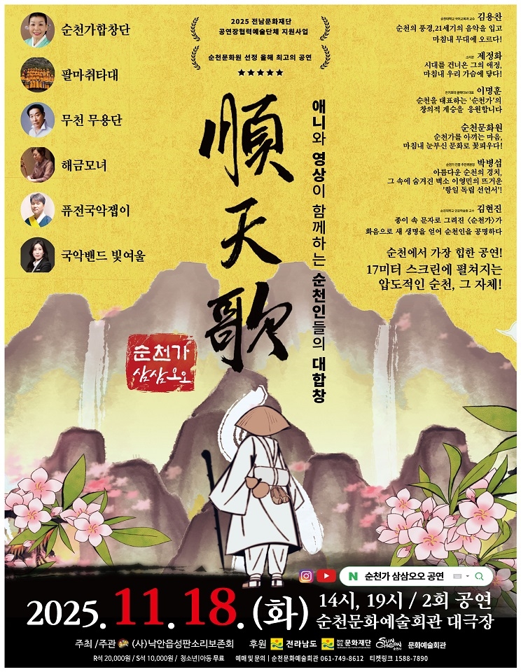 [한국다중뉴스 = 양희성 PD](사)낙안읍성판소리보존회가 100년 전 순천의 정신과 아름다움을 노래한 판소리 순천가를 현대적으로 재해석한 융복합 공연 를 오는 18일(화) 오후 2시, 7시 순천시문화예술회관 대극장에서 선보인다. 이번 공연은 ‘2025전남문화재단 공연장협력예술단체지원사업’에 선정된 작품으로 순천의 문화
