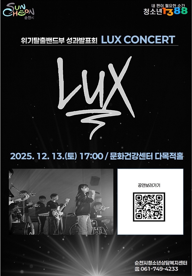 [한국다중뉴스 = 양희성 PD]순천시 청소년상담복지센터는 오는 13일 문화건강센터 다목적홀에서 청소년 밴드 ‘LUX(빛)’ 연말 콘서트를 개최한다. ‘LUX(빛)’는 청소년상담복지센터가 운영하는 고위기 청소년 맞춤형 프로그램 위기탈출 밴드부의 팀명으로, 자해‧자살, 불안‧우울, 한부모가정, 장애, 기초수급 등 다양한