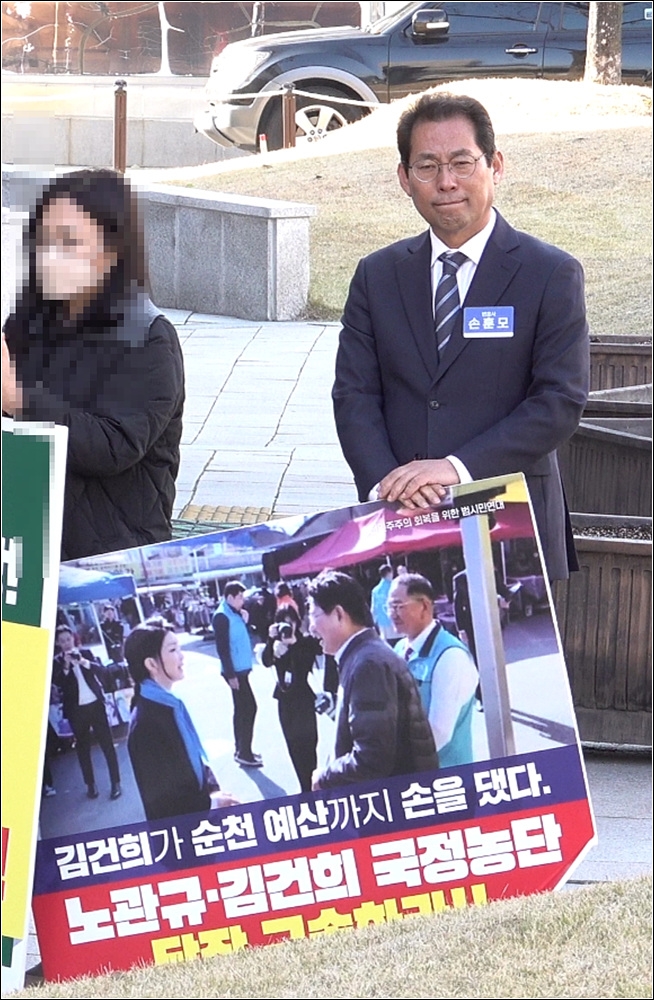 하지만, 이날 기자회견에서는 김건희 사진이 나온 피켓을 들고 이들과 함께 집회에 참가하여 정치소송이 아니라는 항변을 단 몇시간만에 뒤집기도 하였다.